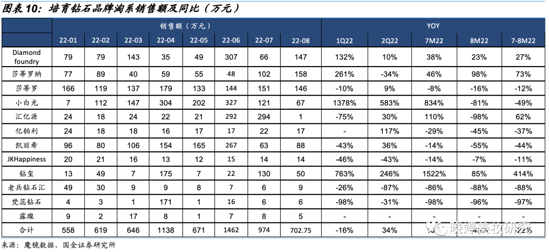 小白光:8月淘系销售额67万元、同比-81%,M7-8同比-49% ,2Q22同增583%。8月销量29件、均价2.3万元,线上产品以婚嫁戒指为主,热销产品GIA/IGI定制钻石(50分-1克拉)销售额65万元、均价4.6万元、销量14件。1克拉裸钻价格1.6-2万元。8月小红书笔记量4300+篇,较7月环比增长13%。