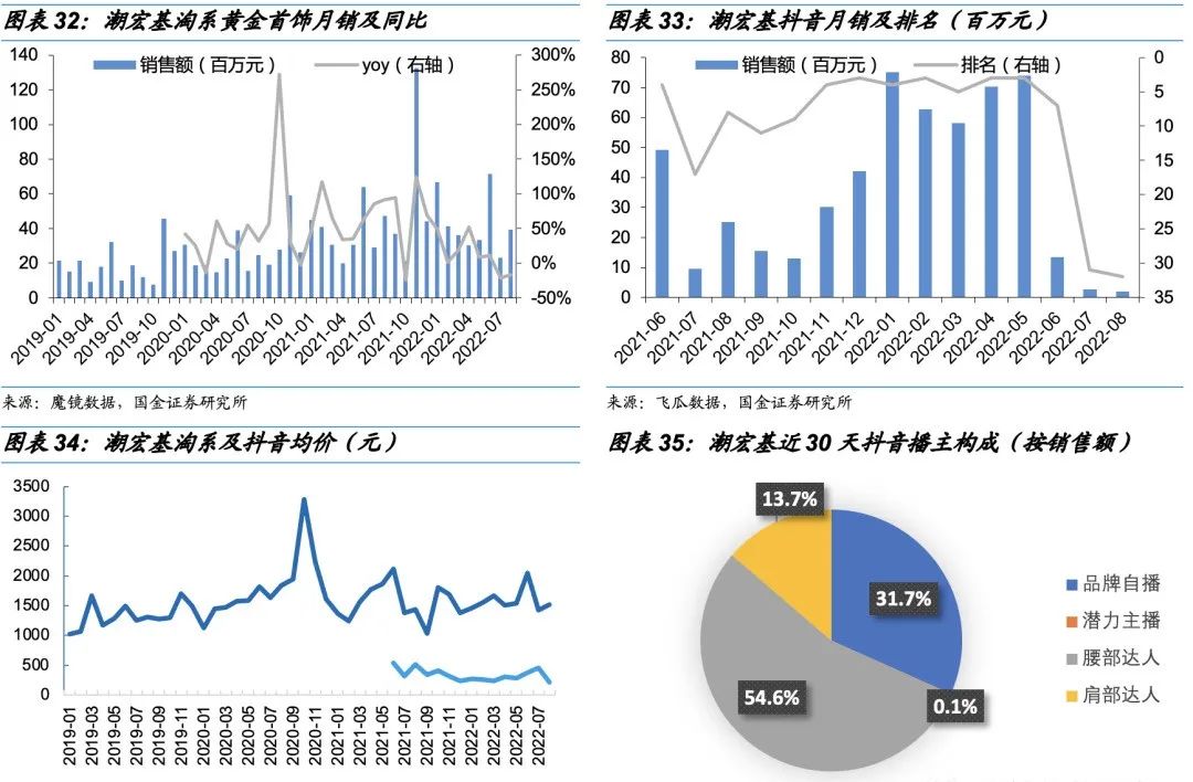 21年11月以来抖音排名中枢提升、稳定在前5,4-5月均为第三名,8月排名下滑至第59。8月销售额192万元,同比-92.37%。抖音渠道近30天品类结构中黄金首饰占比37%,其K金首饰占比2%,此外珍珠/其他天然玉石/和田玉分别占比27%/31%/2%。