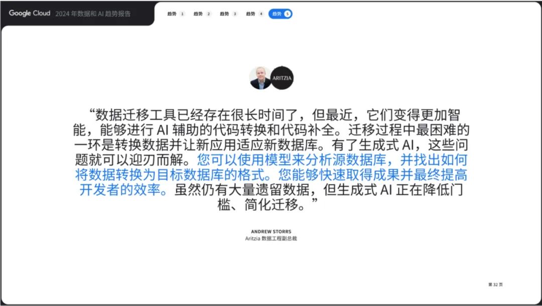 报告强调,生成式AI的发展不仅改变了数据的管理和激活方式,还推动了数据角色的融合和数据治理的重要性。同时,随着AI技术的普及,非技术用户也能够更容易地与数据进行交互,提高了整个组织的数据分析能力。此外,数据平台的现代化改造成为关键,组织需要更新其数据库技术,以支持AI并充分利用数据的潜力。最后,数据治理和数据质量成为创新和成功的关键因素。
