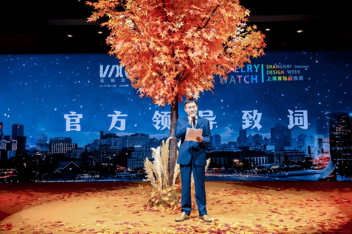 第十一、十二届全国政协常委、原上海市人大常委会副主任郑惠强同志致词、宣布开幕,上海市文化创意产业推进领导小组办公室刘波英副主任出席开幕活动并致词。上海市经济和信息化委员会陈建林副处长、上海钻石宝玉石交易联合管理办公室沈清副主任、上海市知识产权局周志强调研员、 上海市静安区商务委员会姚磊主任、上海市静安区市场监督管理局姚维晔副局长、上海市黄浦区市场监督管理局盛宗任副局长、上海市豫园街道党工委邵泉书记出席。上海市静安区南京西路功能区管委会副主任、九百集团董事长、上海市首饰设计协会许骍会长致开幕词。